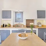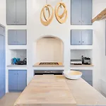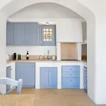 Eine komplette Küche, die in der Villa Seaside 5Bdr Bliss In Mykonos angeboten wird, verfügt über einen Wasserkocher, einen Kühlschrank und einen Toaster. Von dieser Villa sind es 20 Minuten mit dem Auto zum Flughafen Mykonos.